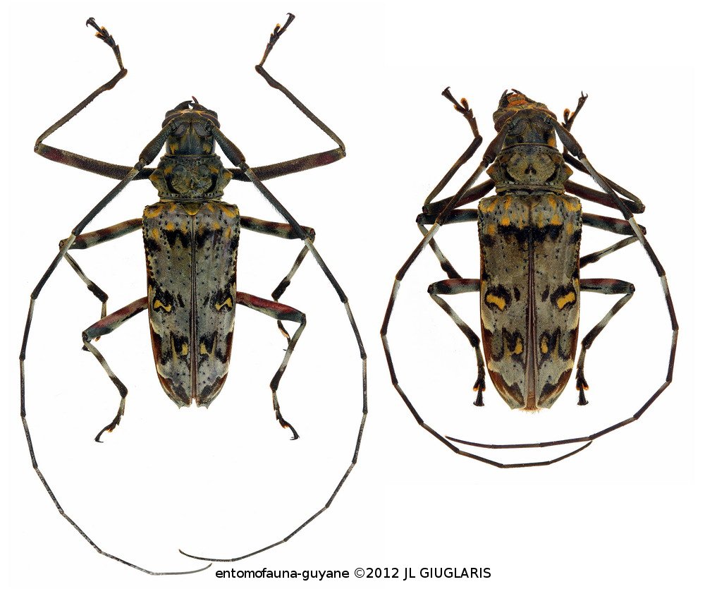 Accueil / Classification organisée et hiérarchisée. / CERAMBYCIDAE Latreille, 1802 / LAMIINAE Latreille, 1825 / ACROCININI Swainson, 1840 / Macropophora trochlearis (Linnaeus, 1758) ♂ & ♀