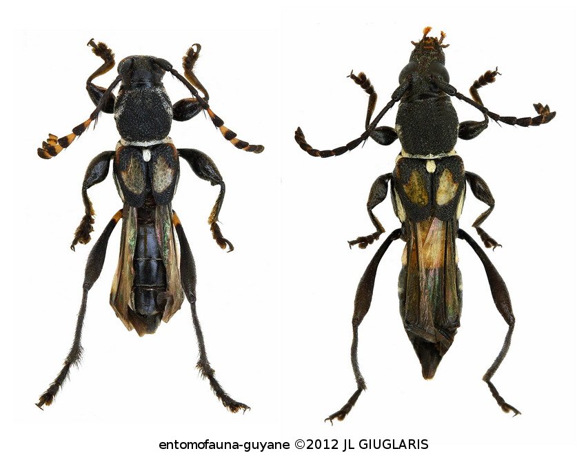 Accueil / Classification organisée et hiérarchisée. / CERAMBYCIDAE Latreille, 1802 / CERAMBYCINAE Latreille, 1802 / RHINOTRAGINI Thomson 1861 / RHINOTRAGINI Thomson, 1861 / Optomerus bispeculifer (White, 1855) ♂ & ♀