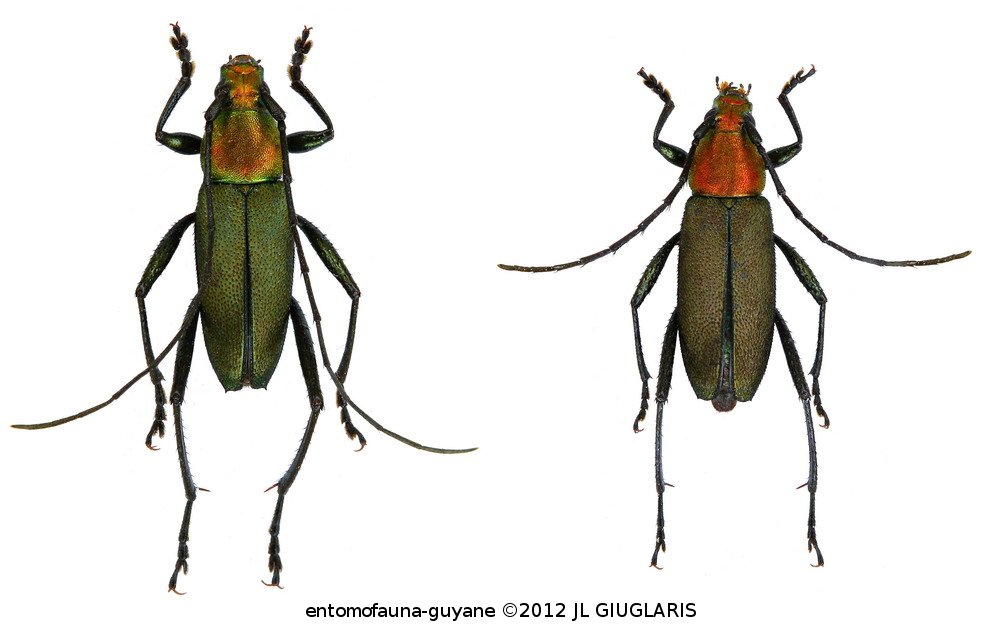 Accueil / Classification organisée et hiérarchisée. / CERAMBYCIDAE Latreille, 1802 / CERAMBYCINAE Latreille, 1802 / DICHOPHYIINI Gistel, 1848 / DICHOPHYIINI Lacordaire, 1869 / Chrysoprasis abyara Napp & Martins, 1998 ♂ & ♀
