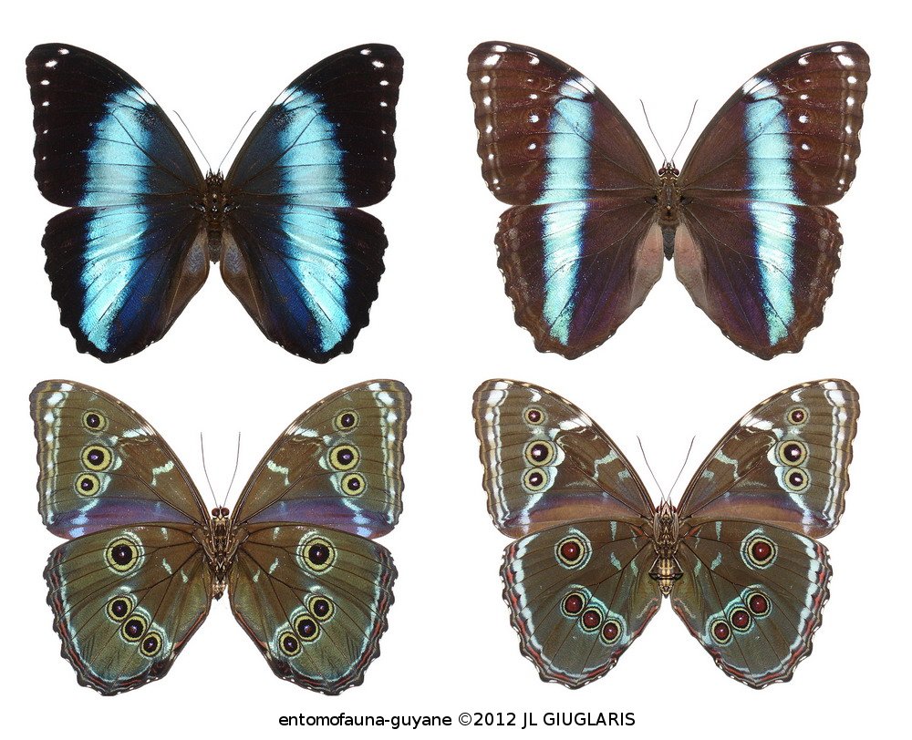 Accueil / Classification organisée et hiérarchisée. / LEPIDOPTERA Linnaeus, 1758 / NYMPHALIDAE Swainson, 1927 / MORPHINAE Newman, 1834 / MORPHINI Newman, 1834 / Morpho helenor helenor (Cramer, 1776) ♂ & ♀