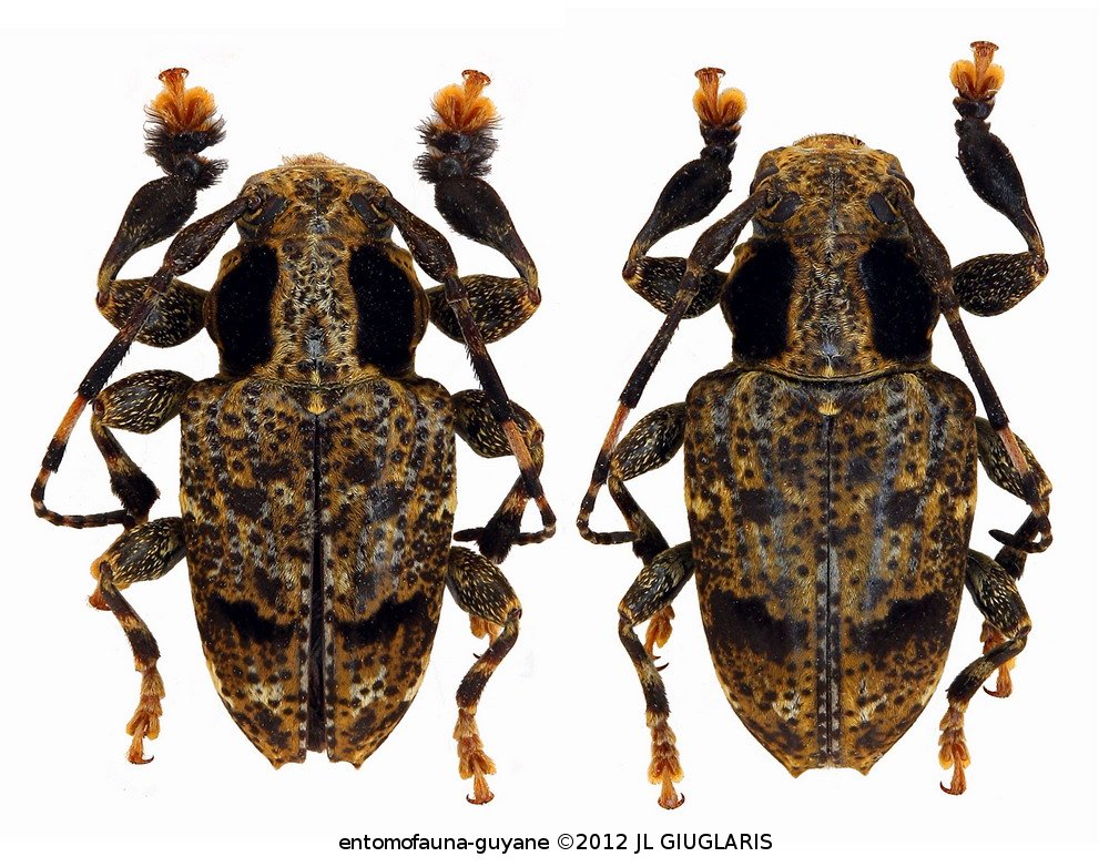 Accueil / Classification organisée et hiérarchisée. / CERAMBYCIDAE Latreille, 1802 / LAMIINAE Latreille, 1825 / ACANTHODERINI Thomson, 1860 / ACANTHODERINI Thomson, 1860 / Mundeu maculicollis (Bates, 1861) ♂ & ♀