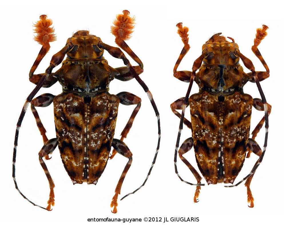 Accueil / Classification organisée et hiérarchisée. / CERAMBYCIDAE Latreille, 1802 / LAMIINAE Latreille, 1825 / ACANTHODERINI Thomson, 1860 / ACANTHODERINI Thomson, 1860 / Aegomorphus chrysopus (Bates, 1861) ♂ & ♀