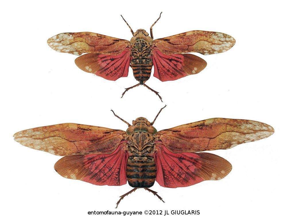 Accueil / Classification organisée et hiérarchisée. / HOMOPTERA Boisduval, 1829 / FULGORIDAE Latreille, 1807 / APHAENINAE Blanchard, 1847 / DILOBURINI Metcalf, 1938 / Aracynthus sanguineus (Olivier, 1791) ♂ & ♀
